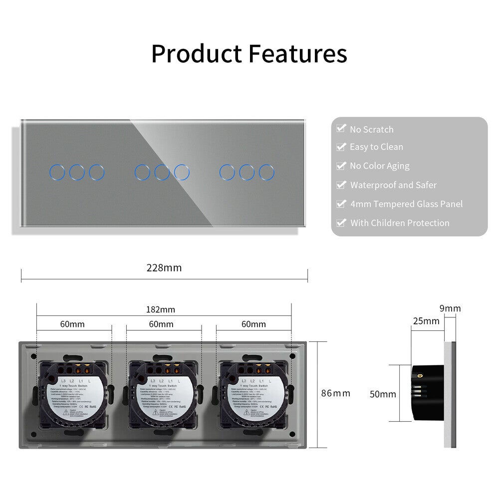 3 fach Touch Schalter 228 x 86 Glas
